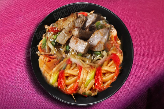 Свинина, фасоль спаржевая, лук репчатый, перец болгарский, морковь, имбирь, чеснок, соус хойсин, соевый соус, кунжут
